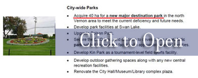 The 2004 Greater Vernon Parks and Recreation Master Plan identified the acquisition of 40 hectares (100 acres) of land for a new Destination Park in North Vernon as the top priority in order to meet current deficiencies and future needs.